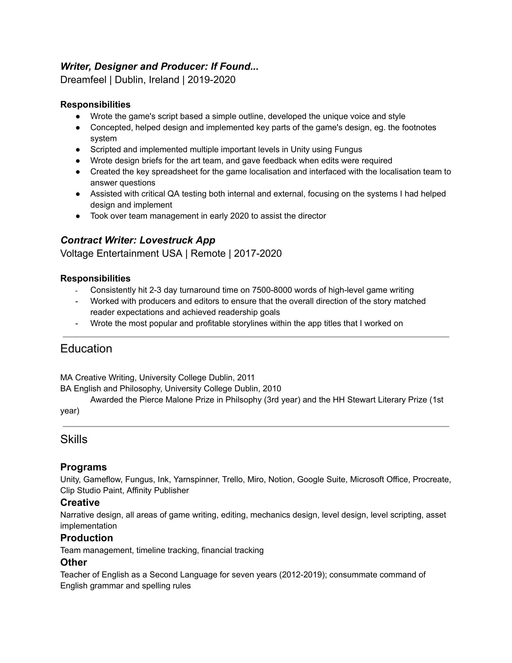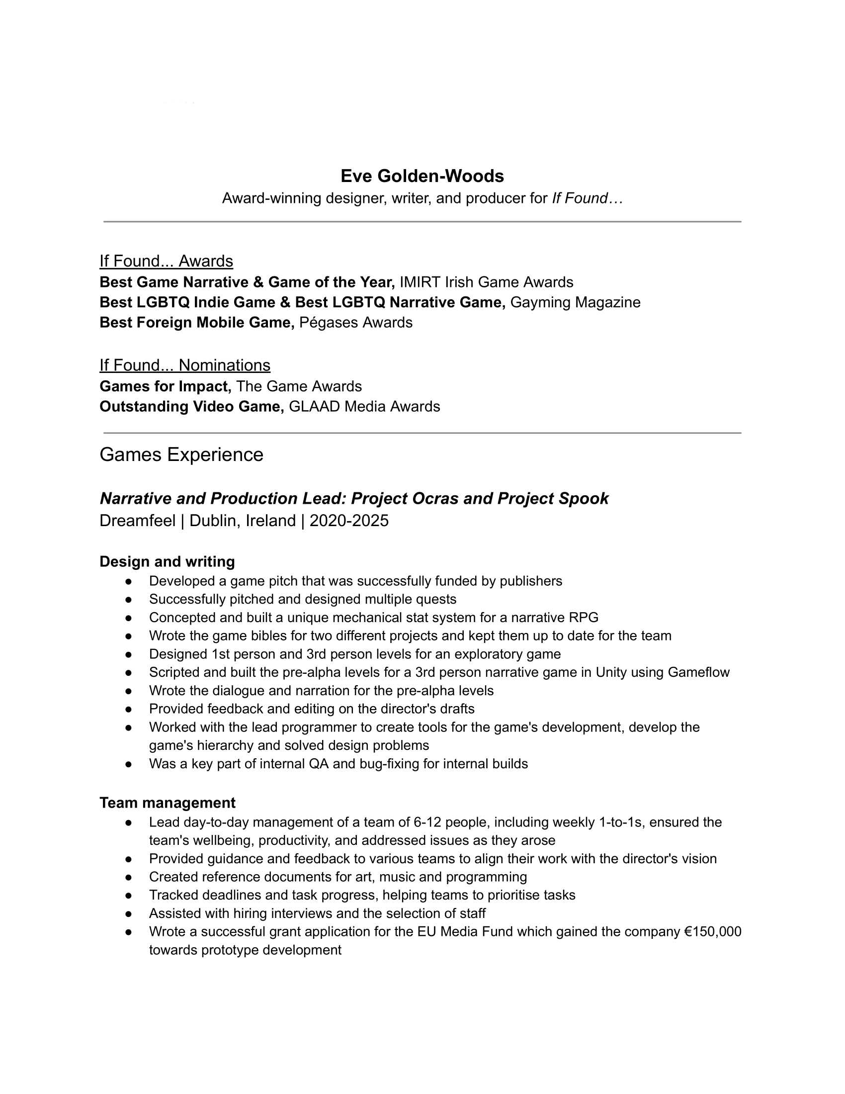 Eve Golden-Woods was born in the west of Ireland, in the famous and beautiful Burren region. At 17 she moved to Dublin and pursued an Arts degree in English and Philsophy, before completing a Masters in Creative Writing. She went on to become an EFL teacher, first in Korea and then in Spain, before returning to Ireland to teach in Dublin. In 2017 she began pursuing games writing seriously, and worked for Voltage Entertainment USA before being hired by Dreamfeel in 2019 to help with the If Found… script. In September of 2019 she joined Dreamfeel on a permanent, full-time basis as a writer and producer, and stayed with the studio until 2025, working variously as a writer, designer and producer on Dreamfeel’s ongoing projects.